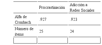 1. Escala de Procrastinación: Esta escala fue elaborada por Iparraguirre, Bernardo y Javier (2014), está conformada por 25 ítems, los 5 últimos constituyen los ítems de seguridad o escala de mentiras. Los 20 primeros exploran las áreas en las que las personas suelen procrastinar: Motivación, falta de conocimientos, falta de método de trabajo y presencia de estrés. La escala original fue modificada en las alternativas de respuesta: siempre, mayoría de veces, regular frecuencia, algunas veces y jamás. Debido a ello se hizo un nuevo análisis psicométrico para el presente estudio, donde se establecieron los niveles de procrastinación como baja (0-46) media (47-81) y alta (82-120). La confiabilidad determinada fue de .927 considerado un nivel elevado de consistencia interna (Murphy & Davishofer; como se citó en Hogan, 2004). La escala propuesta para medir procrastinación posee validez de contenido y validez de constructo. La primera tomó en consideración de definición de la variable, sus dimensiones, subdimensiones y se extrajeron los indicadores a partir de los cuales se construyeron las proposiciones que componen la escala. Se estableció la validez para cada ítem estableciendo la correlación ítem – test , obteniendo correlaciones positivas fuerte para todos los ítems.