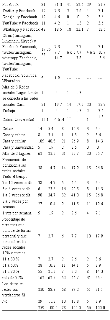 Se aprecia que de acuerdo al tipo de red social más frecuentada. En todos los rangos de edad, el facebook fue la red social más utilizada, en especial, por los estudiantes de 26 a 35 años. Respecto al lugar de conexión más habitual fue en más de dos lugares (casa, trabajo, cabina, universidad y celular), predominantemente, en los estudiantes de 26 a 35 años; sin embargo, los estudiantes de 15 a 25 años optan por acceder más frecuentemente desde su casa o celular.