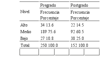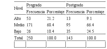 La Tabla 4 se observa los niveles de adicción a redes sociales. Un nivel alto de adicción a redes sociales es representado, en pregrado, por el 21.2% y, en postgrado, por el 9.1%. De otra parte, el 10.4% de los estudiantes de pregrado y el 24.5% de los estudiantes en postgrado presentan niveles bajos.