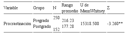 De igual modo, hubo diferencias significativas de procrastinación según el nivel de estudio, a favor del nivel de pregrado (véase Tabla 8).