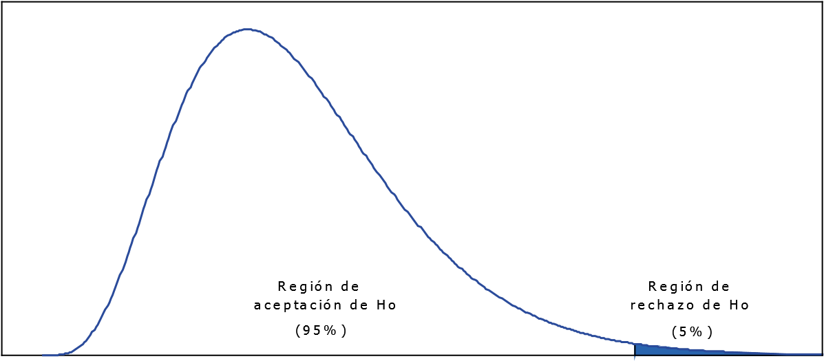 Regla de decisión: El valor teórico de la distribución chi cuadrado con 4 grados de libertad para un contraste unilateral superior y 95% de probabilidad es 9,488. Con ello, se rechazará la hipótesis nula H0 si el valor calculado de la c2 de Pearson es mayor que 9,488; en caso contrario, será aceptada H0 (figura 9). En términos del valor P, se rechaza la hipótesis nula H0 si el valor P es menor que el nivel de significación de 0,05; en caso contrario, será aceptada H0.