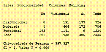 Figura 1. Prueba chi cuadrada para la relación entre bullying y funcionalidad familiarDecisión estadística: Como el valor calculado de la chi cuadrada (597,527) es mayor que 9,488 (se encuentra en la región de rechazo de la hipótesis nula H0), se rechaza la hipótesis nula H0, a favor de la hipótesis de investigación, . Asimismo, el valor P (0) es menor que el nivel de significación habitual de 0,05, con el cual se ratifica la decisión anterior.