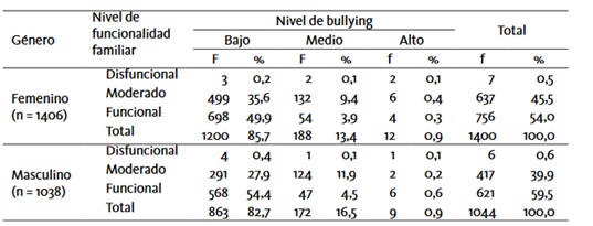 Resumo: O propósito foi determinar a relação entre o bullying escolar e a funcionalidade familiar em estudantes do nível secundário estatais da cidade de Huancayo. Nível correlacional, tipo básico, projeto não-experimental transeccional. Instrumentos utilizados: questionário escala e inventário. Para a validez se aplicou o coeficiente de correlação de Pearson resultando r ≥ 0,2 e para a confiabilidade alfa de Crombach, obtendo valor maior de 0,6. A população foi de 8.808, amostra 2.444 estudantes. Resultado: 54% dos estudantes possuem famílias funcionais, 12,5% são vítimas de bullying. Conclui-se que existe a relação inversa entre as variáveis de estudo.