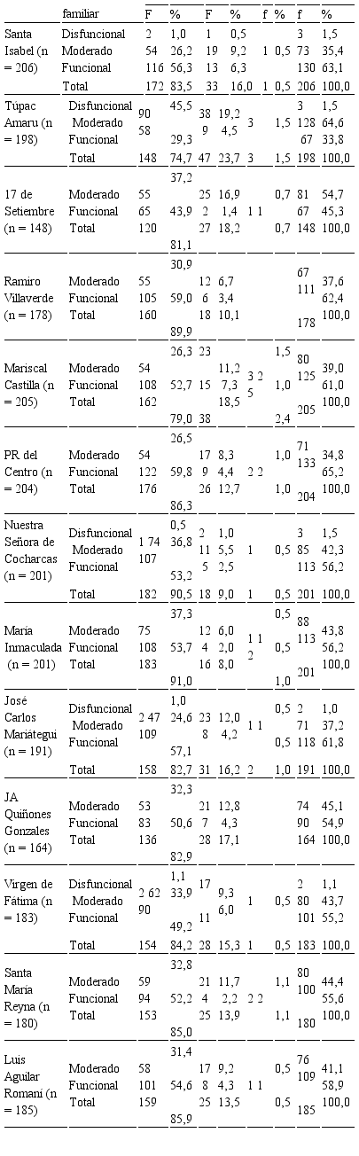 El cuestionario-Escala para la variable funcionalidad familiar se basó en las dimensiones de adaptabilidad, participación (comunicación) , ganancia (emprenden actividades para su desarrollo personal y familiar)Afectividad (afecto de la familia) recursos(exploran recursos en el tiempo, espacio y dinero) y cohesión(lazos emocionales entre los integrantes de la familia).Además familia funcional se considera cuando los miembros de la familia no cumplen sus funciones y no resuelven sus problemas en forma oportuna. Familia moderada, significa que los miembros de la familia cumplen algunas veces sus funciones y a la vez solo algunas veces resuelven sus problemas y Familia disfuncional significa que los miembros de la familia generalmente no cumplen con sus funciones y no resuelven sus problemas de la familia en forma oportuna.