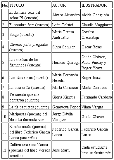 Resulta necesario puntualizar que los textos infantiles cumplieron otros requisitos, libros bellos, ilustrados o libros álbum, con la finalidad de estimular sensorialmente a los lectores, quienes más de una vez solicitaron tocar, manipular o releer el texto; por eso se estima pertinente añadir la lista de selección de ese ciclo por el impacto obtenido, que de acuerdo a los contextos podrían replicarse.