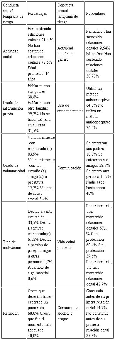 Dentro de nuestros resultados de 2388; 508 adolescentes manifestaron haber sostenido relaciones coitales, lo que representa un 21,3%; mientras que 1862 alumnos manifestaron no haber sostenido, a la fecha de la evaluación, relaciones coitales, lo que representa un 78,7% y el mayor porcentaje de los encuestados La media de la edad de inicio coital: 14,4 D.E: 1,373. El porcentaje de personas de género femenino que han sido entrevistadas y que ya ha iniciado actividades coitales es de 9,54%, En contraste, el porcentaje de personas de género masculino es de de 30,72%.
