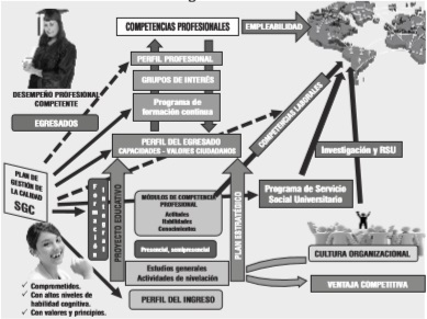 Para sustentar nuestra propuesta de procesos en un sistema de gestión de la calidad para la educación universitaria con formación integral y competencias profesionales hemos elaborado una representación de la actividades de la formación que empieza con el perfil de ingreso a la universidad; pero, nuestra propuesta ene un enfoque de afuera hacia adentro. Este enfoque es sistémico y parte de un conocimiento preciso de la realidad (contexto) internacional, nacional, regional y local de la situación del ejercicio profesional, el mercado laboral y la empleabilidad.