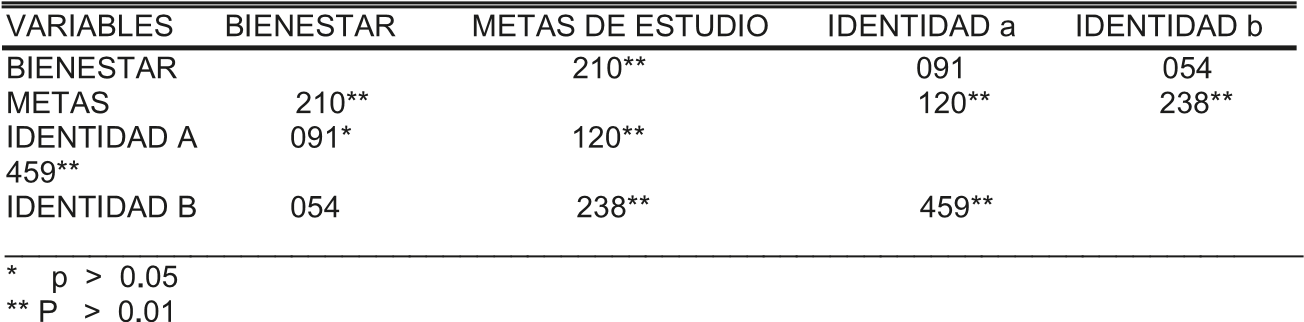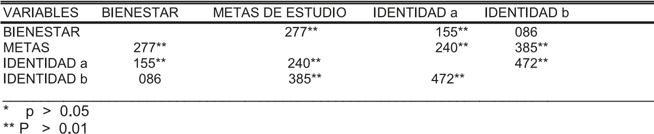 Correlación entre bienestar psicológico, metas de estudio e identidad institucional en la muestra de jóvenes de Huancayo.- La Tabla 5 resume los promedios significativos en su mayoría en el nivel del 0.01 del BP, la ME y la II que correlacionan positivamente y confirma la hipótesis de investigación, que a mayor BP, mayor ME e II y satisfacción institucional.