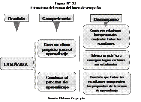 El marco del buen desempeño tiene la estructura de un análisis de factores que consta de: dominio, competencia y desempeño; cada dominio una competencia y a cada competencia varios desempeños a medir.