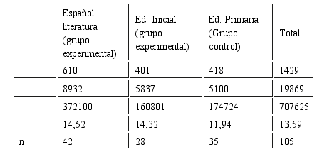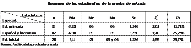 El promedio logrado en la prueba de entrada por los estudiantes de Educación Primaria resultó de 6,20 puntos, mientras que el promedio logrado por los estudiantes de la Especialidad de español y Literatura fue de 4,98 y el promedio de las alumnas de Educación Inicial resultó de 5,11 puntos, en consecuencia los tres promedios fueron puntajes desaprobatorios, sin embargo el promedio de los alumnos de Educación Primaria fue mayor que los demás promedios.