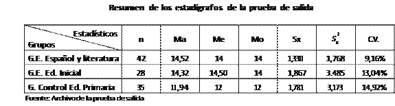b. Estadígrafos de la prueba de salida de los grupos experimentales y grupo control