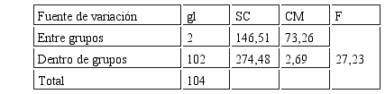 Distribución muestral glE = k-1 = 3-1 =2 gldg = n-k = 105 - 3 =102