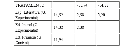 Decisión estadística: Como existe diferencia significativa de promedios entre Español – Literatura (grupo experimental) y Educación Primaria (grupo control) y además existe diferencia significativa de promedio entre Educación. Inicial (grupo experimental y Educación Primaria (grupo control); en consecuencia se rechaza la hipótesis nula y se acepta la hipótesis alterna.