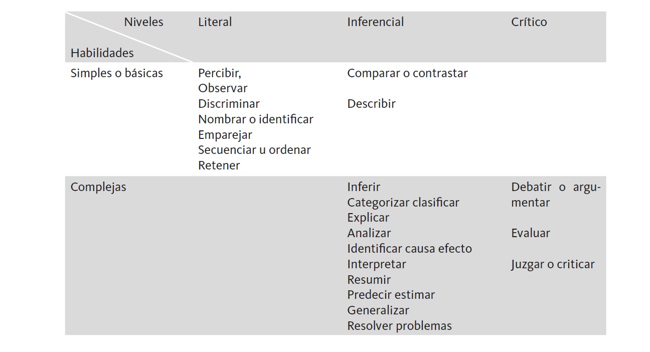 Finalmente hay necesidad de poner énfasis en el desarrollo de habilidades para el nivel inferencial: Percibir, observar, discriminar, nombrar o identificar, emparejar, secuenciar u ordenar, retener. La habilidades para el nivel inferencial se requiere la participación de operaciones lógicas del pensamiento que conforman habilidades complejas que son: Inferir, comparar o contrastar, categorizar o clasificar, describir, explicar, analizar, identificar causa efecto, interpretar, resumir, predecir, estimar, generalizar, resolver problemas. Par el nivel crítico se pone en juego un juicio de valor que lleve a emitir una opinión o juzgar algo. Para ello se requiere de habilidades como: Debatir o argumentar, evaluar, juzgar o criticar.