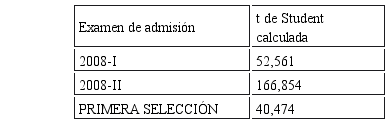 Respecto al poder de discriminación de todos los tipos de prueba de los exámenes de admisión aplicados, en el espacio temporal ya mencionado; presentaron un nivel discriminativo entre intermedio y aceptable, lo que se dedujo comparando con el Cuadro de Clasificación de la Discriminación (Cortada, 1999, p. 192) pero, para fines psicométricos, es necesario que el poder discriminativo sea de 0,30 como mínimo (Nunnally y Berstein, 1995) Entonces sólo serían aceptadas como pruebas con poder de discriminación 5 de las 9 pruebas aplicadas; pero, realizada la prueba de hipótesis t de student y tomando los resultados de ésta como criterio válido (Visauta y Martori, 2003) se acepta que todas los tipos de prueba de los exámenes de admisión, discriminan contundentemente, por su grado de conocimientos a los postulantes, ya que aprueban e ingresan sólo los postulantes con alto grado de conocimientos y los que aún no lo poseen se siguen preparando o en su defecto toman otras opciones académicas.