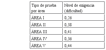 Los cinco tipos de prueba del examen tuvieron un nivel de exigencia DIFÍCIL, para fines psicométricos, esto se obtuvo comparando con el Cuadro de Clasificación de Nivel de Dificultad (Cortada, 1999, p.182).