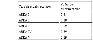 Los promedios del poder de discriminación de los 80 ítems, para los cinco tipos de prueba del examen tuvieron un poder de discriminación entre intermedio y aceptable, lo que se obtuvo comparando con el Cuadro de Clasificación de la Discriminación (Cortada, 1999, p.192) pero, para fines psicométricos, es necesario que el poder discriminativo sea de 0,30 como mínimo. Entonces sólo serían aceptadas como pruebas con poder de discriminación a las pruebas de las áreas I, IV y V.