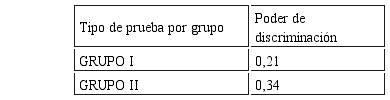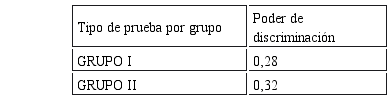 Los promedios del poder de discriminación de los 80 ítems, para los dos tipos de prueba del examen tuvieron un poder de discriminación entre intermedio y aceptable, lo que se obtuvo comparando con el Cuadro de Clasificación de la Discriminación (Cortada, 1999, p. 192) pero, para fines psicométricos, es necesario que el poder discriminativo sea de 0,30 como mínimo. Entonces sólo serían aceptadas como pruebas con poder de discriminación a las pruebas del grupo II.