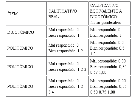 Esta fórmula se aplica directamente cuando los ítems son dicotómicos, es decir, los ítems han sido totalmente respondidos; pero cuando los ítems son politómicos, primero se tienen que establecer las equivalencias de ítem politómico a dicotómico (con el cuadro de equivalencias propuesto), porque un ítem puede haber sido parcialmente respondido; lo que implica que a la matriz de ítems politómicos reales (con valores de 0; 1; 2; 3 ó 4) se la modifique para obtener una nueva matriz de ítems equivalentes a dicotómicos, mediante una multiplicación del calificativo real del ítem por el factor ponderativo, lo que da como resultado ítems ponderados, así como un calificativo total modificado. En esta nueva matriz de ítems ponderados, los valores, ahora, están comprendidos entre cero (0) y uno (1), tal como se aprecian en el cuadro de equivalencias.