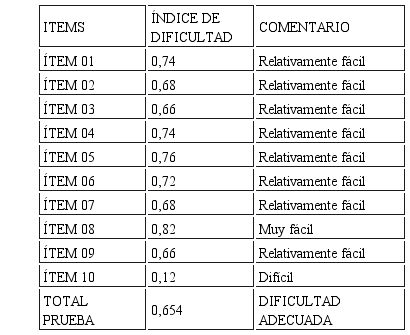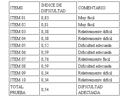 Como se puede apreciar los índices de dificultad de los ítems, de acuerdo al cuadro clasificador, están comprendidos como relativamente fáciles (8 ítems) y muy fáciles (1 ítem) y tan sólo el ítem 10 es difícil; es más, la prueba en su totalidad tiene una dificultad adecuada.