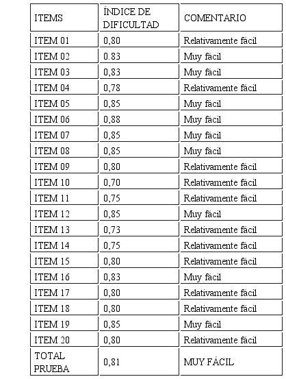 Como se puede apreciar los índices de dificultad de los ítems, de acuerdo al cuadro clasificador, están comprendidos como muy fáciles (2 ítems), relativamente difíciles (4 ítems), relativamente fáciles (1 ítem) y de dificultad adecuada (3 ítems); es más, la prueba en su totalidad tiene una dificultad adecuada.