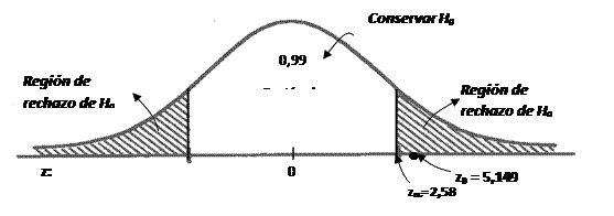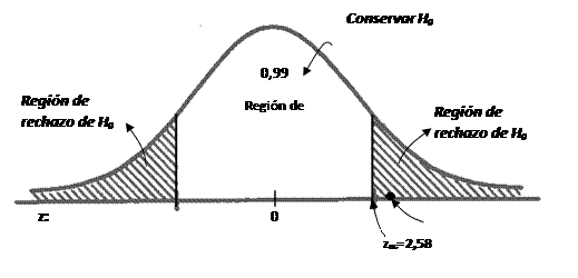 Al elegir el nivel de significancia de α = 0,012 colas o 1% dos colas o bilateral, esto quiere decir que observamos una probabilidad de 0,01 o 1% de rechazar la hipótesis nula Ho y una región de aceptación al 0,99; y la respectiva curva.