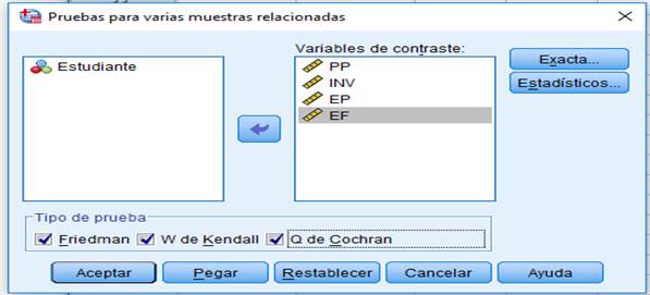 En el software SPSS se encuentra siguiendo la ruta: Analizar >>> Pruebas no paramétricas >>> Cuadro de diálogos antiguos >>> m muestras relacionadas, se muestra la siguiente ventana: