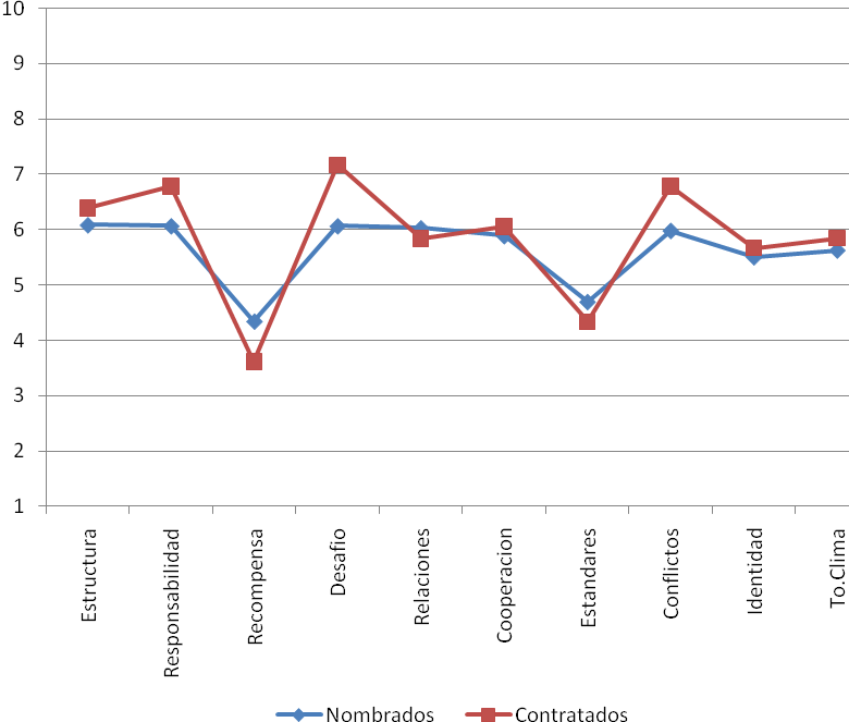 En el grupo de nombrados la percepción es casi lineal en la tendencia positiva siendo sus debilidades recompensa y estándares, se puede observar que la coincidencia de percepción entre ambos grupos esta precisamente en estas dimensiones, perciben como que la institución no utiliza en forma sistemática más el premio que el castigo, así mismo que la institución no enfatiza en las normas de rendimiento.