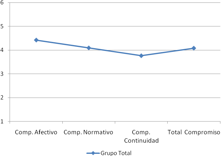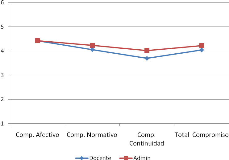 Contrastando los tipos de compromiso organizacional según la categoría laboral docentes y administrativos, tampoco hemos encontrado diferencias significativas, ubicándose ambos grupos dentro del grado cuatro con un perfil mayor para el compromiso afectivo, menor para el compromiso normativo y menor aún para el compromiso de continuidad.