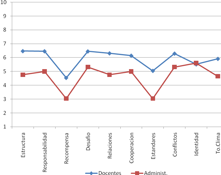 Las dimensiones en que los docentes obtienen valores promedios significativamente mayores a los registrados por los administrativos son: estructura, responsabilidad, recompensa, relaciones, cooperación y estándares.
