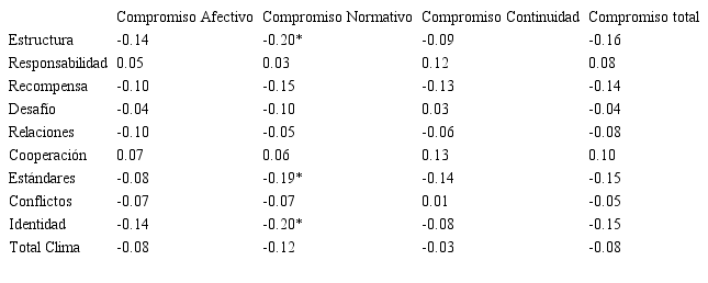 Las dimensiones y el total general del clima organizacional no correlacionan significativamente con los tipos de compromiso organizacional y con el total.