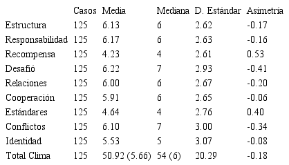 El presente análisis se efectúa con el propósito de identificar y describir cada dimensión del clima organizacional en el grupo estudiado, partiendo de las medias aritméticas, valores de la mediana y de la asimetría. Debemos indicar que cada una de las dimensiones arroja valores que van desde el grado 1 hasta 10, la media aritmética 5.5 indica el punto de corte de las respuestas hacia una u otra forma de percibir. La mediana nos indica el valor escalar que ha sido alcanzado hasta por el 50% de los examinados, la asimetría nos dice si la concentración de puntajes está por encima de la media (asimetría negativa) o si los puntajes se concentran por debajo de la media (asimetría positiva). Para interpretar los datos hemos utilizado la tabla de conversión de puntajes directos a puntuaciones escalares que reproducimos a continuación.