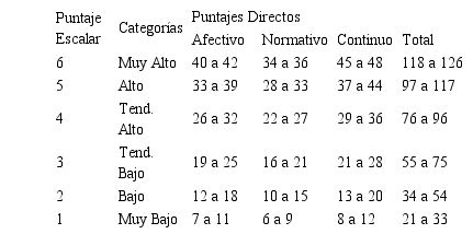 Con el propósito de caracterizar el compromiso organizacional del grupo examinado hemos efectuado un análisis similar al anterior y utilizando la tabla de conversión de puntuaciones directas a categorías y a puntaje escalar que a continuación se reproduce hemos obtenido los siguientes resultados que presentamos a continuación.