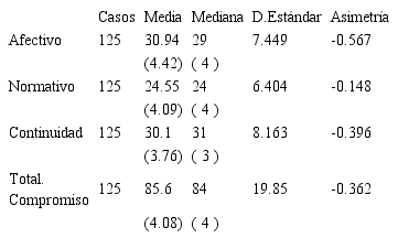 En compromiso afectivo y normativo las medias aritméticas se ubican en el grado 4 que corresponden a tendencia a alto compromiso afectivo y normativo, de modo que el 50% de examinados consideran estar comprometidos por sentimiento y por lealtad con la institución, es conveniente indicar que el otro 50% estaría ubicado en el grado 3 a menos, este hallazgo indica la presencia de trabajadores con sentimientos polarizados y casi en porcentajes similares.