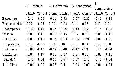 Al obtener los coeficientes de correlación para el grupo total, no hemos encontrado correlaciones significativas entre las dimensiones y el total del clima organizacional con el tipo afectivo y de continuidad del compromiso organizacional, sólo hemos registrado tres coeficientes significativos en lo correspondiente a la dimensión estructura del clima con el tipo normativo del compromiso organizacional con un coeficiente de -0.20 que resulta significativo al 0.05 de margen de error y que nos indica que en la medida que la estructura es percibida como flexible, menos burocrática, disminuye el compromiso normativo, lo que significa que el compromiso de lealtad con la institución se relaciona inversamente con la rigidez de la estructura organizacional, de allí que cuando disminuye la rigidez procedimental aumenta la deslealtad institucional.