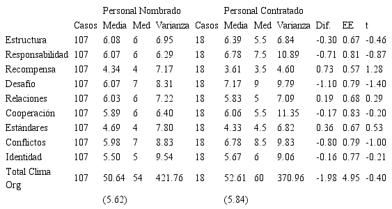 Al contrastar los resultados del clima organizacional según la condición de nombrados y contratados no encontramos diferencias significativas que nos indica que los nombrados y contratados tienen una percepción similar del clima de la institución. En ambos casos sus debilidades por registrar puntuaciones por debajo de cinco, corresponde a la dimensión de recompensa y estándares es decir no percibe que la Institución enfatice en el premio por el trabajo bien realizado, ni por las normas de rendimiento