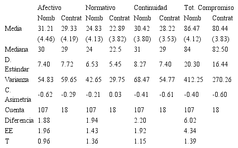 Contrastando los tipos de compromiso organizacional según la condición laboral, nombrados y contratados, no se encuentran diferencias significativas, los resultados nos dicen que el compromiso afectivo se ubica en el grado cuatro ligeramente más alto que el compromiso normativo, siendo menor el compromiso de continuidad en grado tres, lo que significa que hay una clara tendencia negativa, que nos dice que el personal en general considera que puede retirarse de la Institución sin mayor perjuicio personal.