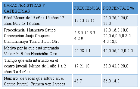 En la tabla 1, se observa las características generales de los adolescentes infractores internado en el Centro Juvenil de El Tambo del programa intermedio; donde el 26,0% son menores de 15 años de edad, de 16 y 17 años de edad es el mismo porcentaje; así mismo albergan jóvenes mayores de 18 años de edad en un 22,0% quienes están cumpliendo con las medidas correctivas dictadas por el Ministerio de Justicia. Con respecto a la procedencia; el 20,0% de los adolescentes infractores proceden de la provincia de Jauja, seguida por Satipo con un 16,0%, Huancayo con un 12,0%, Concepción 10,0%, Tarma con un 8,0%, la Provincia de Chupaca, Chanchamayo con un 6%, la provincia de Junín con un 4% y con un 18% de adolescentes que proceden de otros departamentos del país. Los motivos por lo que están internados los adolescentes infractores son: el 56,0% manifiestan que es por robo, seguida por el 40,0% que manifiestan que están por motivo de violación, el 2% por homicidio y otros motivos. Con respecto a los números de veces que han sido internados ellos manifiestan que es por primera vez un 86,0% y por segunda vez un 14,0%.