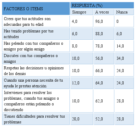 Referido al respeto de las opiniones de los demás, el 66,0% “a veces”, el 24,0% “nunca” y el 10,0% “siempre”; cuando una persona necesita de tu ayuda le prestas atención el 64,0% de los adolescentes respondieron “a veces” le presta atención, el 24,0% “nunca” y el 12,0% “siempre” está atento para servir a su prójimo; si Ud. Interviene para resolver problemas de sus amistades o compañeros cuando están peleando o discutiendo el 62,0% “a veces” intervienen, el 28,0% “nunca” interviene frente a estos hechos y el 10,0% “siempre” están atentos para ayudarlos; si han tenido dificultades para resolver sus problemas el 52,0% “a veces”, el 28,0% “nunca” y el “20,0% “siempre” se han presentado dificultades para resolverlos.