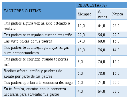 En la tabla 4, observamos datos del factor de riesgo medio ambiental social en lo familiar, donde los resultados nos muestran lo siguiente: si alguna vez tus padres han sido detenidos o recluidos, el 64,0% respondieron que “a veces” y el 10,0% siempre han sido detenidos por la policía o recluidos al algún establecimiento penitenciario; si recibiste castigos por parte de tus padres cuando fuiste niño, el 56,0% “a veces” y el 22,0% “siempre”; si han sido testigos de la pelea de sus padres, el 60,0% de los adolescentes respondieron “a veces” y el 24,0% “siempre”; si recibiste recomendaciones y/o consejos por parte de tus padres , el 76,0% respondieron que “a veces” y el 14% “nunca”, si tus padres te corrigieron cuando te portaste mal, el 76,0% “a veces” y el 16,0% “nunca”; si recibiste afecto, cariño y palabras de aliento por parte de tus padres, el 78,0% respondieron que “a veces” y el 16,0% “nunca”, si tus padres aportan a la economía del hogar para cubrir gastos de alimentación, educación, salud entre otros, el 74,0% “a veces” y el 20,0% respondieron que “nunca”; si tus padres cuentan con la economía necesaria para solventar sus gastos de alimentación, educación, salud y otros el “64,0% “a veces” cuentan con los recursos y el 32,0% respondieron que “nunca” cuentan con los recursos para solventar gastos del hogar.