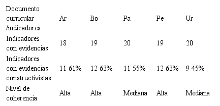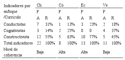 El número de indicadores con evidencias en cada documento es: 22 en el de Chile; 8 en el de Colombia; 13 en el de Ecuador y 11 en el de Venezuela. De los cuatro diseños curriculares, los de Chile y Venezuela arrojaron un nivel de coherencia bajo: en ambos casos, el enfoque con evidencias del mayor número de indicadores (el constructivista) agrupa una proporción de indicadores que está entre el 41% y 60%; el restante 40% a 59% de criterios con evidencias se distribuye entre los otros dos enfoques. Específicamente, para el caso de Chile el 55% corresponde al enfoque constructivista, el 31% al enfoque conductista y el 14% al enfoque cognitivista. Para Venezuela el 45% corresponde al enfoque constructivista, el 37% al enfoque cognitivista y el 18% al enfoque conductista.