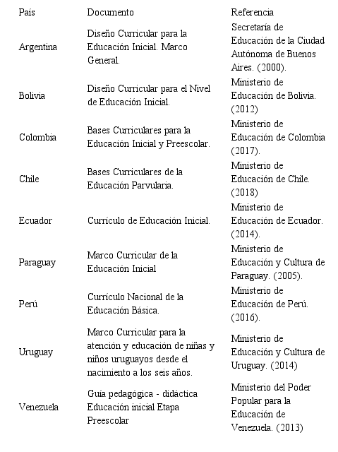 3. Pre-análisis: colección de documentos: los diseños curriculares de Educación Inicial de los nueve países de habla hispana de Suramérica: Argentina, Bolivia, Colombia, Chile, Ecuador, Paraguay, Perú, Uruguay y Venezuela. (véase Tabla 1).