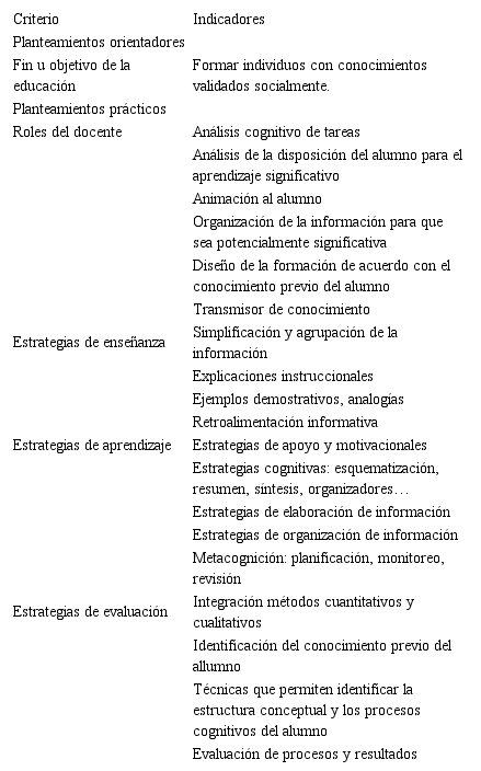 En la Tabla 3 se observa igual proporción de indicadores (4) para las Estrategias de Enseñanza como para las Estrategias de Evaluación. Para las Estrategias de Aprendizaje se presenta (5) indicadores. Ello señala, en alguna medida, un cambio en relación al conductismo, en la atribución de importancia a acciones del docente y del alumno en el proceso educativo: aunque continúa dándose mayor importancia a las acciones del docente –sobre todo porque la evaluación sigue siendo responsabilidad fundamental de este‒, se asignan al estudiante un papel más estratégico en el aprendizaje.
