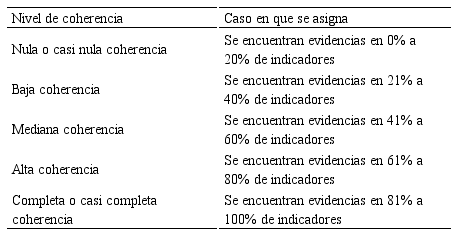 Luego de la aplicación del instrumento respectivo a cada documento que explicita su enfoque de aprendizaje, se aplica la escala expuesta en la Tabla 5, con fines de determinar el nivel de coherencia interna del documento.
