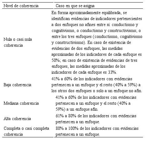 Como muestra la Tabla 6, para los documentos curriculares con el enfoque de aprendizaje no explícito, los casos en que se asigna cada nivel de coherencia de la escala empleada deben considerar la posibilidad de que el currículo presente indicadores asociados con uno, dos o tres enfoques. Así, entonces, el nivel de coherencia a atribuir depende de las proporciones de los posiblemente encontrados indicadores de cada enfoque. Nótese que, consistentemente con este razonamiento, una nula coherencia se encontraría en un documento curricular en el que se encuentran indicadores de dos enfoques, con una proporción aproximada de 50% de cada grupo de indicadores; o en un documento en que se presentan indicadores de tres enfoques, con una proporción aproximada de 33% de cada grupo. Así va la escala hasta el máximo valor (completa o casi completa coherencia), el que se asigna si el 80% o más de las evidencias corresponden a un enfoque en particular.