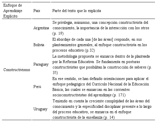 Se encontró que cinco (5) de los diseños curriculares manifiestan explícitamente sustentarse en un enfoque de aprendizaje: el constructivismo. Los mismos son los documentos de Argentina, Bolivia, Paraguay, Perú y Uruguay. La Tabla 7 presenta evidencias de la presentación explícita de los enfoques de aprendizaje en los referidos cinco (5) diseños curriculares. Como puede verse, en los cinco diseños curriculares registrados se hace explícito que los mismos se sustentan en el enfoque de aprendizaje constructivista. En uno de ellos, el de Perú, se precisa que tal enfoque es el constructivismo social.