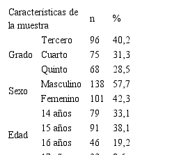 La población de estudio fue conformada por 630 estudiantes que cursaban el séptimo ciclo de educación básica regular (tercero cuarto y quinto grado de secundaria) de una institución educativa pública de Puerto Maldonado y la muestra fue constituida por 239 estudiantes, cantidad que fue determinada a través de un muestreo probabilístico estratificado. En la tabla 1 se detalla las características de la muestra.