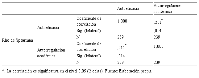 Segundo: Se determinó la existencia de una relación directa y significativa entre la autoeficacia y la autorregulación académica de los estudiantes (rs= 0,211; p=0,014<0,05).