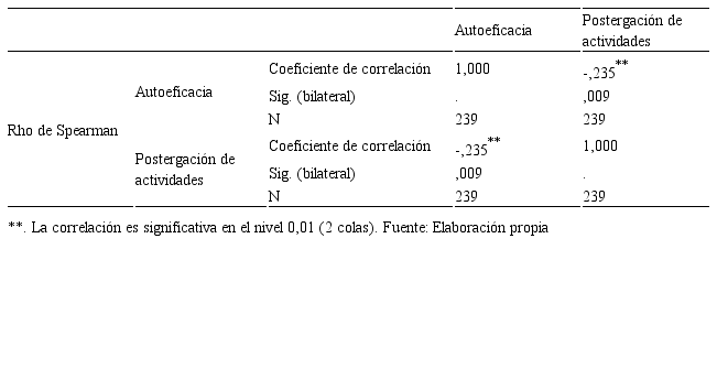 Primerio: Se determinó la existencia de una relación inversa y significativa entre la autoeficacia y la procrastinación académica de los estudiantes (rs= -0,221; p=0,012<0,05).