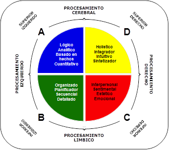 Con este fin, Herrmann (1995) analizó los diferentes estilos de pensamiento y aprendizaje de los trabajadores. A partir de eso, dibujó un mapa del cerebro basado en la teoría del cerebro triuno de Mclean (figura 1) y cerebro derecho e izquierdo de Sperry (1973). Herrmann desarrolló la teoría de los cuadrantes cerebrales y describió cuatro modos de pensamiento. Son cuatro formas diferentes en que las personas teóricamente tienden a aprender, pensar, crear, interactuar y entender la vida. En el modo de pensamiento del cuadrante A, las son personas muy racionales que recogen datos de hechos concretos. Las personas analíticas también tienden a ser competitivas e individualistas, así como inteligentes e irónicas. Además, tienden a tener un buen sentido del humor. Los trabajos más adecuados para este modo de dominación cerebral son los relacionados con matemáticas, física, ingeniería, química, entre otros. En el modo de pensamiento del cuadrante B son personas organizadas que ama el orden y es meticuloso. No hacen nada sin haberlo planeado primero. Les gusta todo lo que es predecible, conservador y bajo su control. En general, las personas en este cuadrante de "organización" serían buenos directores de empresas, gerentes, contadores, entre otros. El modo del cuadrante C se refiere al dominio del cerebro que tiende hacia las emociones y la necesidad de conectarse con los demás. Se relacionan con otros y disfrutan del contacto social donde pueden sentirse útiles, dar y recibir. Son personas buenas para comunicarse, espontáneas y extrovertidas. En general, prefieren trabajos como periodismo, enfermería, trabajo social, defensa, entre otros. En modo de pensamiento del cuadrante D, cuarto perfil de dominio cerebral se refiere a personalidades con mentes holísticas. Son personas visuales, espontáneas y altamente creativas. Son personas a quienes les gusta experimentar e innovar, incluso si esto conlleva un riesgo. Siempre están mirando hacia el futuro, pero también intentan aprender del presente. Entonces, veremos gente de modo del cuadrante cerebral D trabajando como arquitectos, escritores, músicos, pintores, diseñadores, y otros.